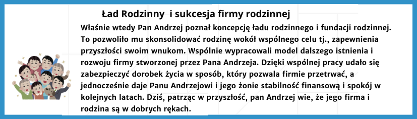 Świadome wdrożenie ładu rodzinnego w procesie sukcesji daje gwarancję ciągłości i bezpieczeństwa dla firmy i jej majątku, spokoju i przewidywalności w rodzinie, a także szacunku i wsparcia dla seniorów rodu, którzy są fundamentem tej historii. Wprowadzenie fundacji rodzinnej i spisanych zasad sukcesji to dziś najlepsza inwestycja w przyszłość, która w równym stopniu chroni dorobek materialny i niematerialny, budując międzypokoleniowy most oparty na wspólnym celu, współpracy, szacunku i długoterminowej wizji.