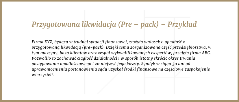 Przygotowana likwidacja (pre-pack) jest procedurą, która rozpoczyna się na etapie postępowania w przedmiocie ogłoszenia upadłości, a zatem jeszcze przed faktycznym ogłoszeniem upadłości dłużnika. Przygotowana likwidacja daje dłużnikowi możliwość świadomego wyboru nabywcy majątku (czy to całego przedsiębiorstwa, jego zorganizowanej części czy też jedynie wartościowego składnika majątkowego) po określonej we wniosku i zaakceptowanej przez sąd cenie. Spełnienie ustawowych warunków przy tej procedurze pozwala przeprowadzić likwidację wskazanych składników majątku w ciągu 30 dni od dnia uprawomocnienia się postanowienia sądu w zakresie zatwierdzenia takiej sprzedaży. Jest to najkorzystniejszy sposób likwidacji majątku dla wszystkich uczestników postępowania upadłościowego, bowiem przekłada się na zmniejszenie jego kosztów, a tym samym na wyższy stopień zaspokojenia wierzycieli. Z uwagi na obszerność tego tematu, w niedalekiej przyszłości poświęcony zostanie temu zagadnieniu odrębny artykuł.